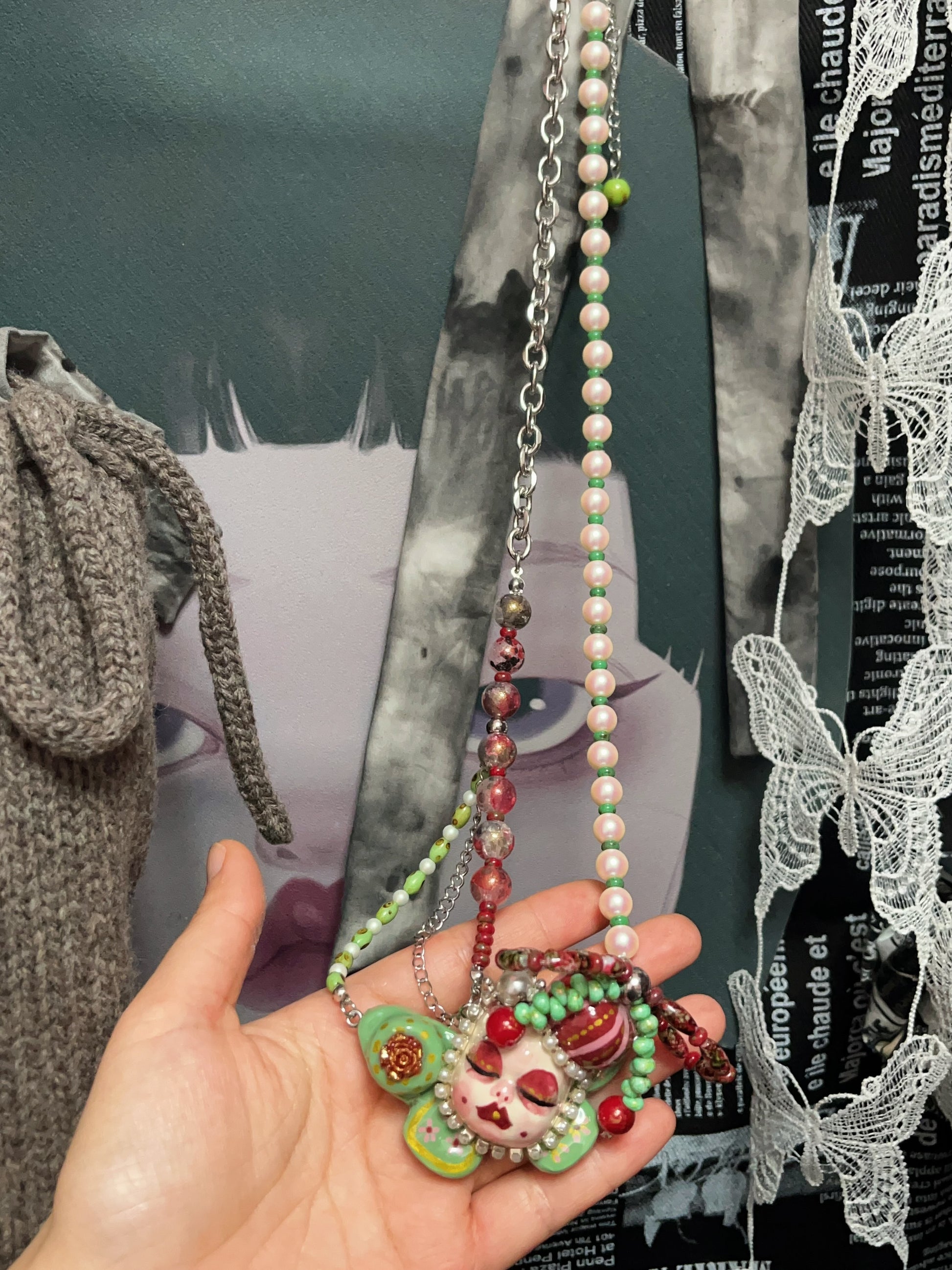 This handmade polymer clay necklace features a creepy doll face pendant with vivid hand-painted details, accented with colorful beads and pearls. Perfectly suited for Halloween, gothic fashion, and cosplay, this unique statement piece is both eerie and artistic. Each necklace is individually crafted, ensuring no two are alike.